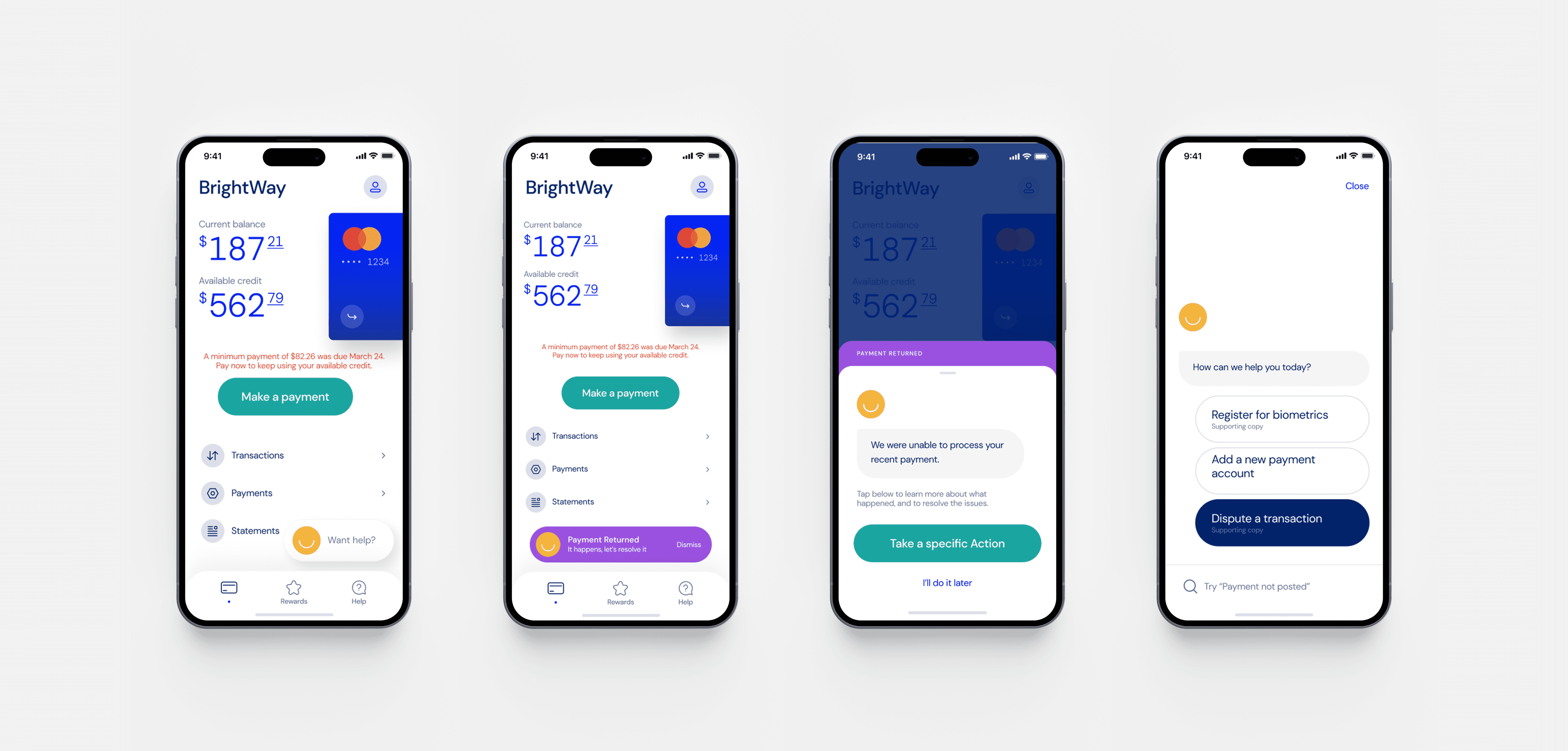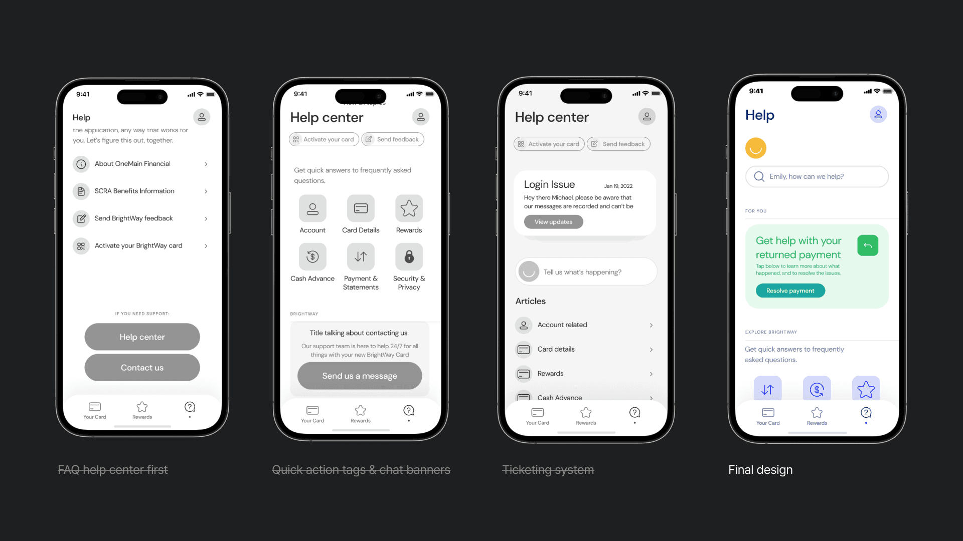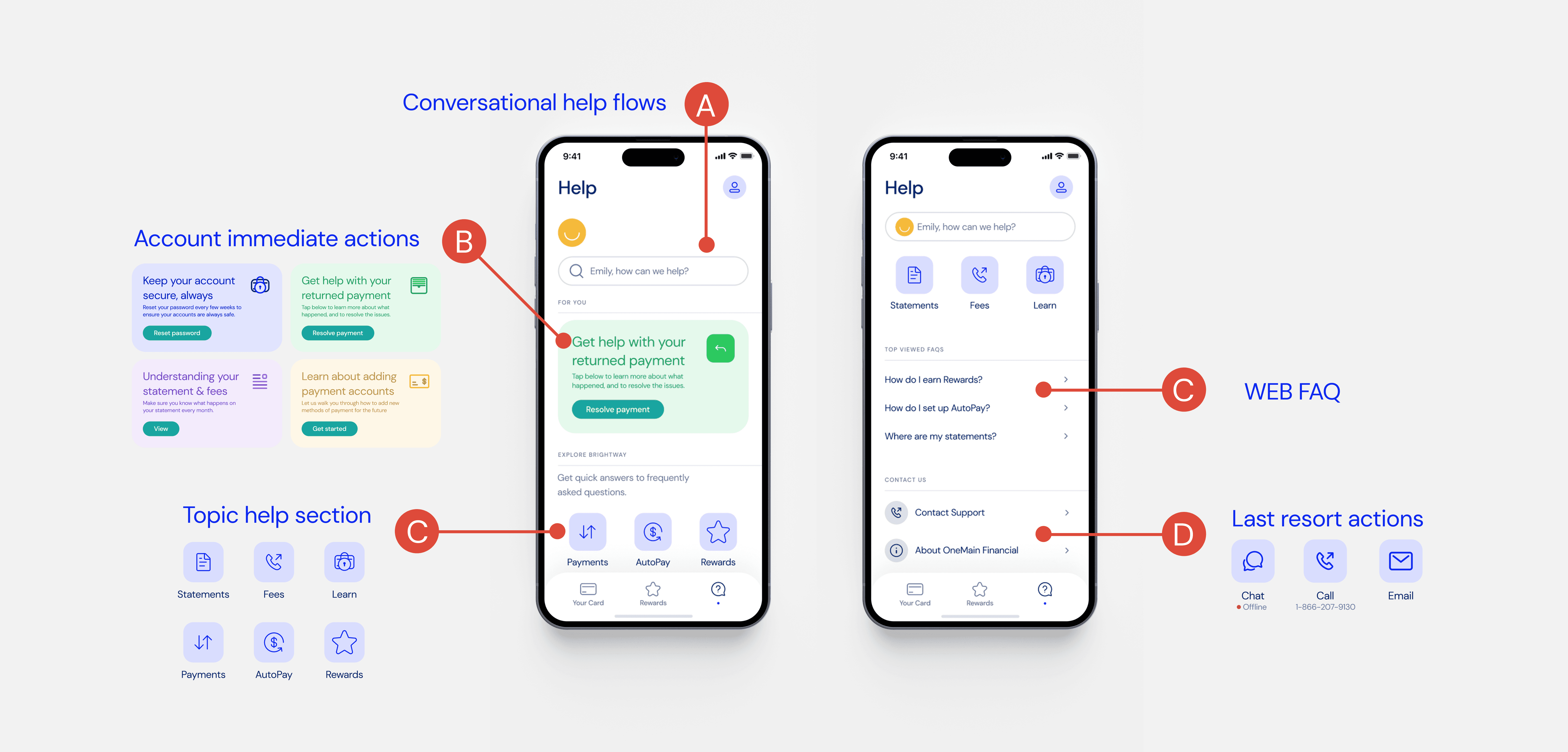 The proactive approach aimed to anticipate user needs, directing them to chat self-service flows before resorting to the call center. Moreover, there are many visual elements that can be used to guide users to complete an action. By taking the BrightWay straightforward design principle as my guideline, I have elevated the brand emoticon of BrightWay making it an integral part of the resolution process. The emotional aspect of the yellow happy emoji makes the whole process a tiny bit better than a generic help icon personalizing the brand and creating a positive emotional connection.