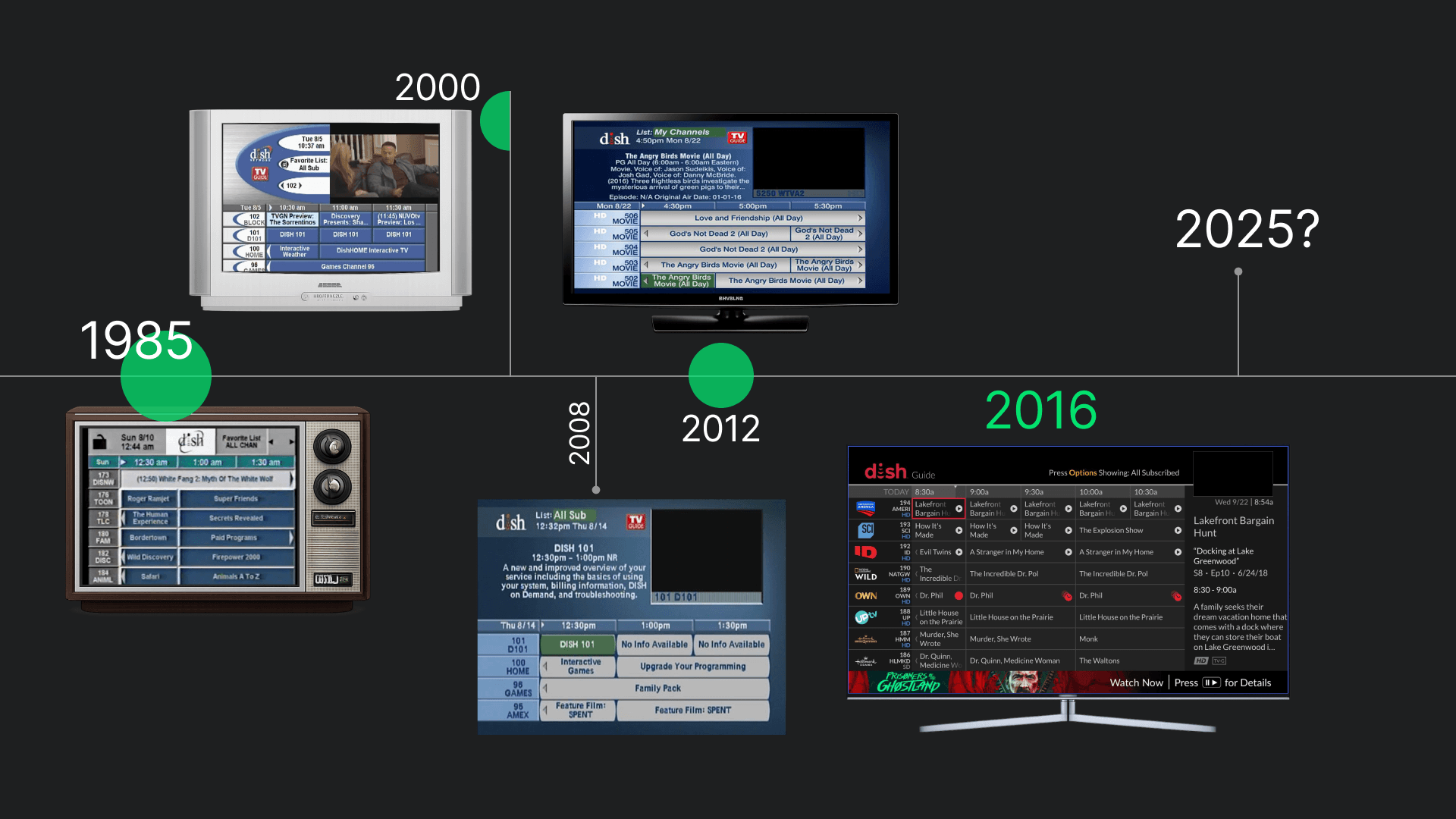 The Dish TV Guide has been redesigned multiple times over the past three decades to keep pace with evolving technology and shifting consumer expectations. Before initiating a new redesign, I intentionally looked backward, studying previous iterations and the rationale behind them, because many of the original decisions were made with care and any new solution needed to respect that legacy. This redesign was also scoped exclusively for Dish Android TV set top boxes, which introduced specific technical, performance, and interaction constraints that directly influenced design decisions.