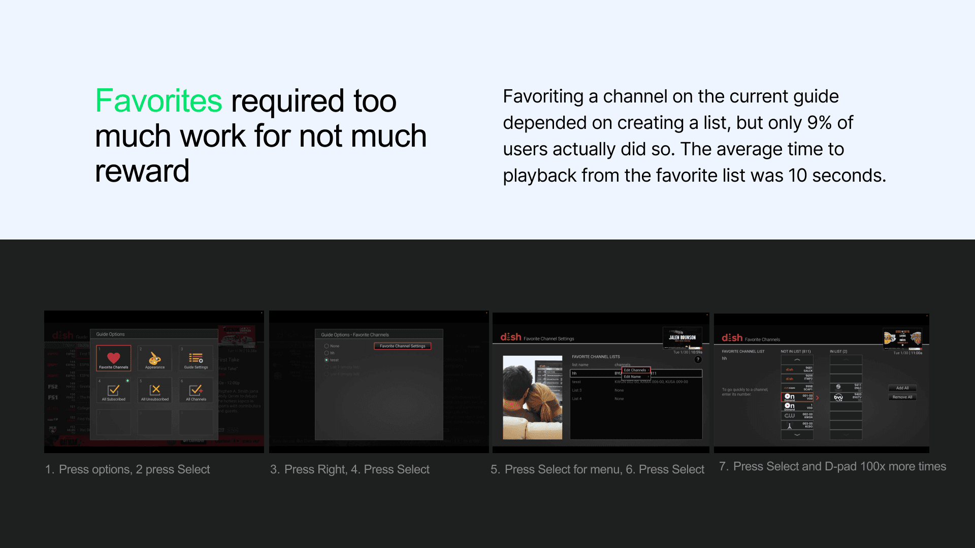 Favorites emerged as a high value but underutilized feature. Users navigated favorites in three distinct ways. Memorization, writing channel lists on paper, or manually curating favorites through a settings menu. The friction was too high for the perceived reward. In response, I moved Favorites out of settings and placed them front and center in the guide, paired with an immediate filter. This change dramatically reduced effort and increased engagement.