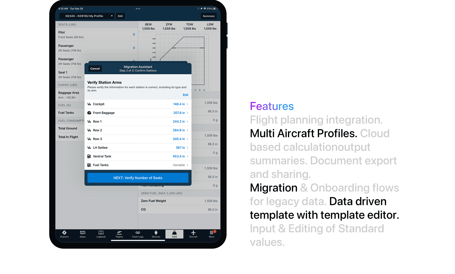 The revamped W&B aimed to overhaul the underlying logic to accommodate multiple aircraft profiles. This necessitated the design of seamless flows to ensure a smooth transition of legacy data to its new location. Additionally, I developed onboarding flows to facilitate a clear understanding of the changes for users accustomed to a feature utilized by pilots since 2010.
